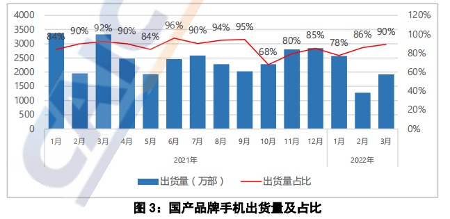 2022年1-3月,国产品牌手机出货量累计5764.9万部,同比下降33.5%,占同期手机出货量的83.1%;上市新机型累计98款,同比下降14.8%,占同期手机上市新机型数量的95.1%。