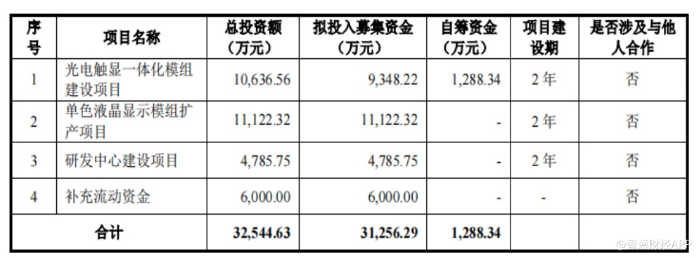 天山电子本次IPO的核心目标就是为了解决产能压力。招股书显示,公司拟募集资金3.13亿元(人民币,下同),其中1.06亿元用于光电触显一体化模组建设项目;1.11亿元用于单色液晶显示模组扩产项目;0.48亿元用于研发中心建设项目;0.6亿元用于补充流动资金。