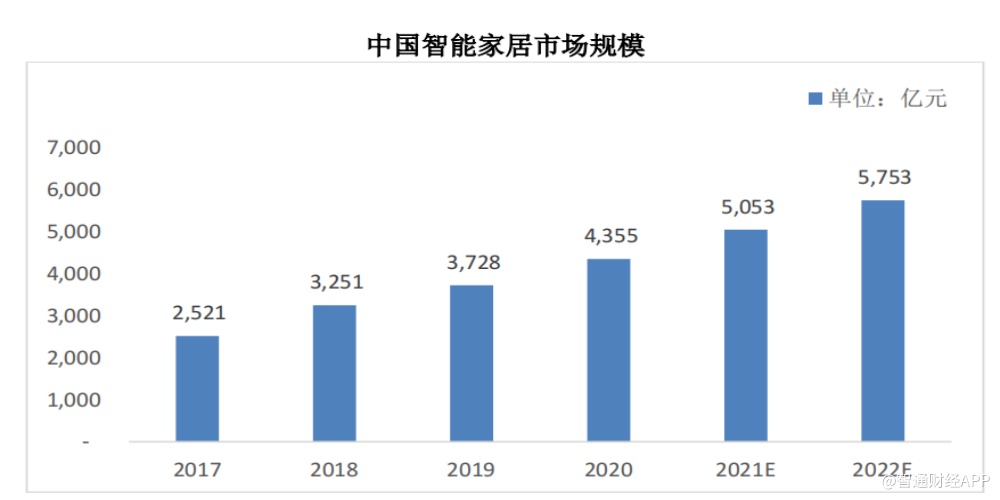 以智能家居市场为例,根据西南证券研究报告,中国智能家居市场规模将由2017年2,521亿元增长至2022年5,753亿元。