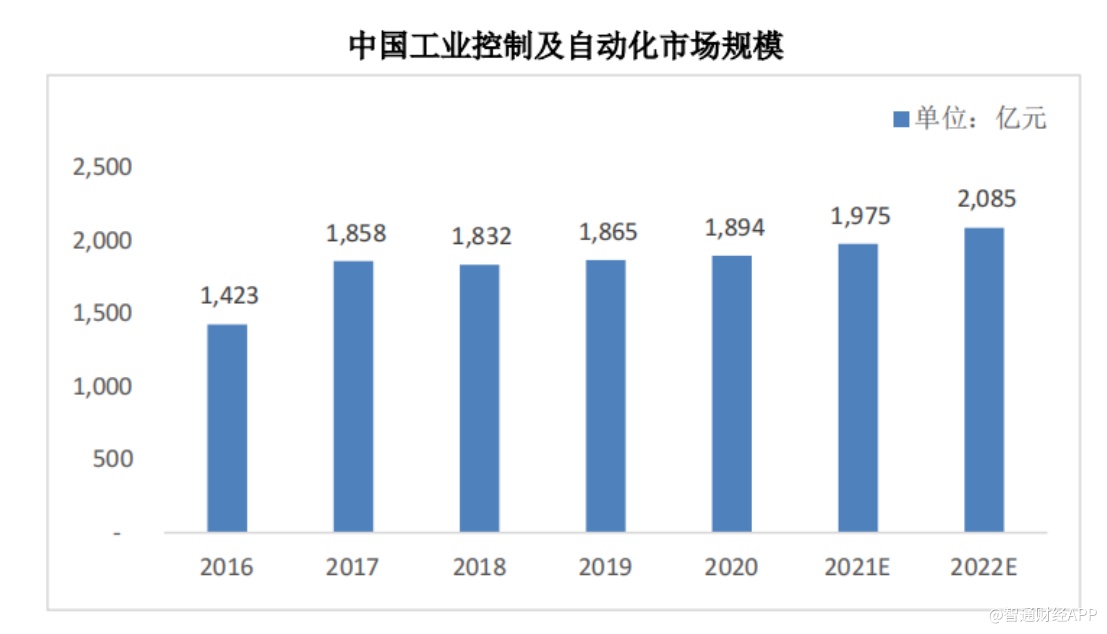 根据工控网、前瞻产业研究院数据,中国工业控制及自动化市场规模保持快速增长趋势,中国工业控制及自动化市场规模将由2016年1,423亿元增长至2022年2,085亿元。