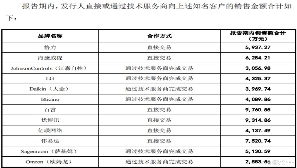 天山电子在招股书中表示,凭借优质的产品和服务,公司与深天马形成长期战略合作关系,并直接或通过技术服务商与上述行业应用领域的知名企业如格力、海康威视、Johnson Controls(江森自控)、LG、Daikin(大金)、Bticino、百富、优博讯、亿联、伟易达、Sagemcom(萨基姆)、Omron(欧姆龙)等建立了长期稳定的合作关系。