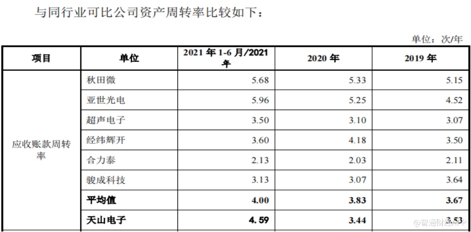 与同行业可比公司资产周转率对比来看,天山电子2021年上半年的应收账款周转率为4.59次/年,高于可比公司均值4次/年。