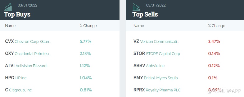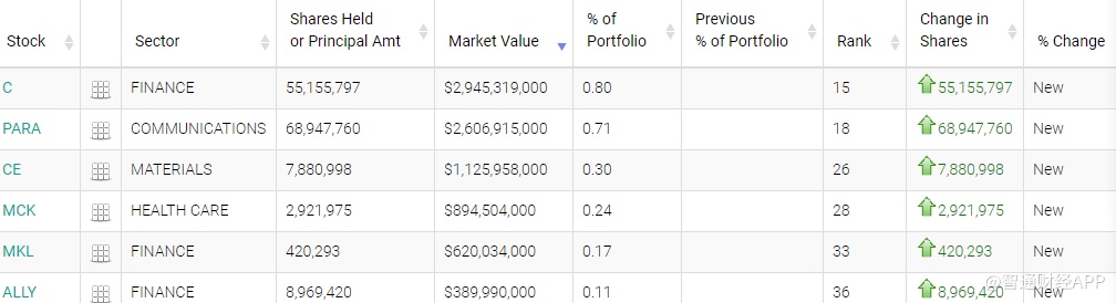 从持仓比例变化来看,前五大买入标的分别是:雪佛龙、西方石油(OXY.US)、动视暴雪(ATVI.US)、惠普(HPQ.US)和花旗集团(C.US)。