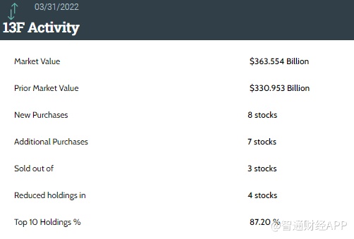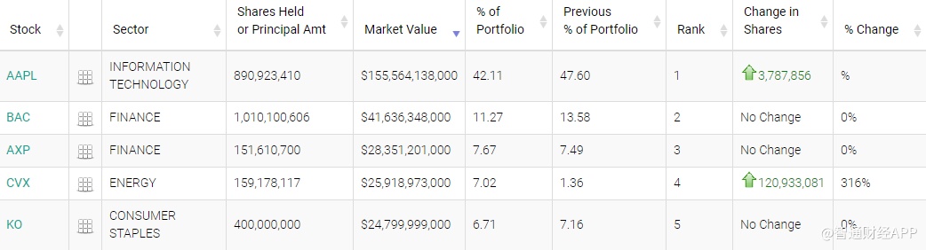 在前五大重仓股中,苹果(AAPL.US)仍位列第一,持仓约8.91亿股,持仓市值约1555.64亿美元,占投资组合比例为42.11%。