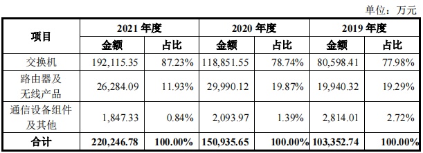 就规模来看,报告期内交换机始终是菲菱科思的第一大类别产品,期内销售收入分别为8.06亿元、11.89亿元、19.21亿元,占比分别为77.98%、78.74%、87.23%。同期,公司的路由器及无线产品的收入分别为1.99亿元、3亿元、2.63亿元,占比为19.29%、19.87%、11.93%。