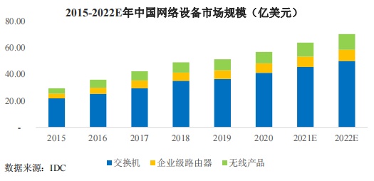 2020年在疫情的影响下,全球网络设备市场增速放缓甚至下降,而随着我国疫情得到逐步控制,根据IDC数据,2020年我国交换机市场规模为41亿美元,同比增长12.68%;路由器市场规模达到7.20亿美元,同比增长9.56%。2021年上半年,我国交换机市场规模为20.83亿美元,同比增长17.06%,企业级路由器市场规模为3.58亿美元,同比增长 17.90%。