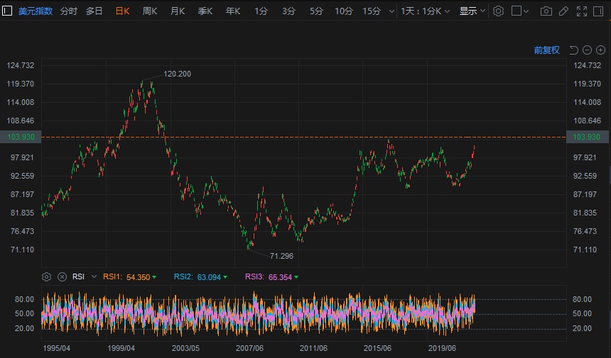 智通财经APP观察到,今年以来屡创阶段性新高的美元指数已连续三个交易日走弱,自上周五以来美元指数跌幅达0.86%。今日外汇市场开盘后美元指数一度回升至104.23点,但随后再度走弱,截至发稿跌0.39%至103.750。