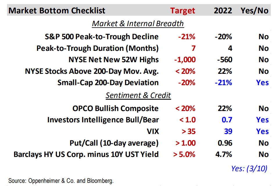 智通财经APP了解到,华尔街知名金融机构Oppenheimer在报告中表示,美股即将见底,但所需条件的一半以上尚未满足。该行技术面分析师Ari Wald 在一份报告中写道,现在该公司对美股见底10项必要条件后的方框中有3个已经打钩,而上周只有1个钩。