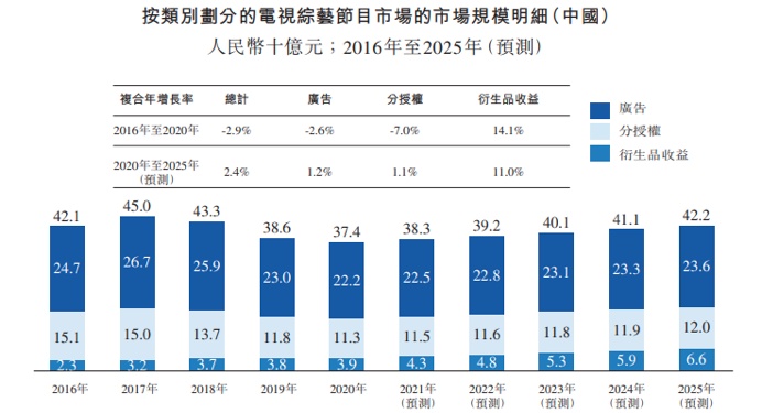 从行业来看,整个中国综艺节目市场规模已在2017年达到顶峰,在此之后,由于电视台广告收入下降及电视综艺节目播出数量下降,电视综艺节目市场规模有所下滑,至2020年达到374亿元。2021年以来,《关于进一步加强“饭圈”乱象治理的通知》、《关于开展文娱领域综合治理工作的通知》及《关于进一步加强文艺节目及其人员管理的通知》等一系列监管重锤的推出,也使得文娱行业备受打击。