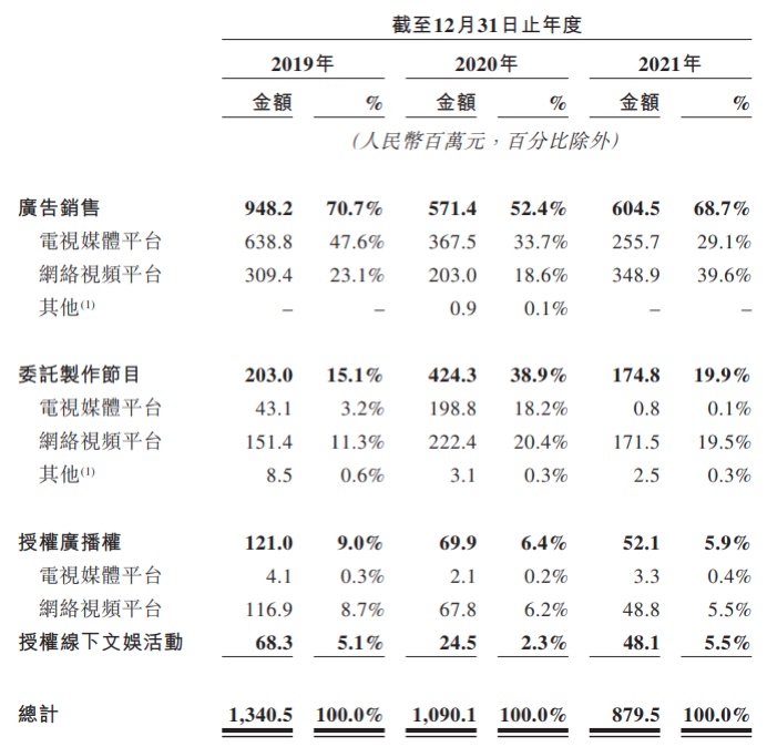 从公司出品的节目来看,《中国好声音》仍作为公司的王牌综艺,为综艺节目IP运营及授权业务贡献了三成收入。但报告期内来自该节目的收入却在持续下滑,分别为4.91亿元、3.25亿元及2.52亿元。而在企业客户广告预算下降及新冠疫情的影响下,来自该综艺的毛利率更是由2019年的46.6%大幅减少至2021年的仅2.2%。