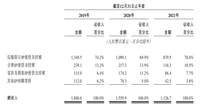 作为公司的主要收入来源,综艺节目IP运营及授权业务的收入为公司贡献了超七成收入。但来自该业务的收入却在报告期内持续下滑,分别为13.41亿元、10.90亿元、8.80亿元。