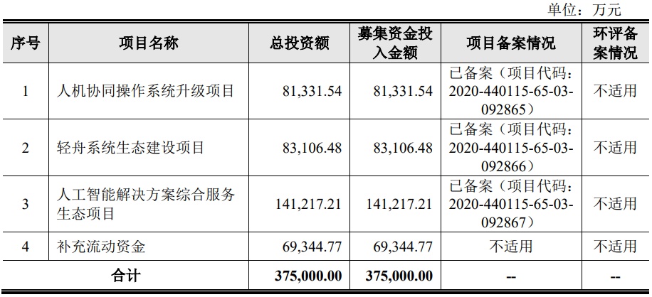 招股书显示,本次发行募集资金合计37.5亿元,重点将投向人机协同操作系统升级、轻舟系统生态建设、人工智能解决方案综合服务生态三个项目。