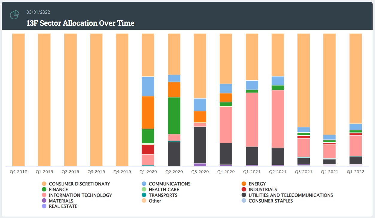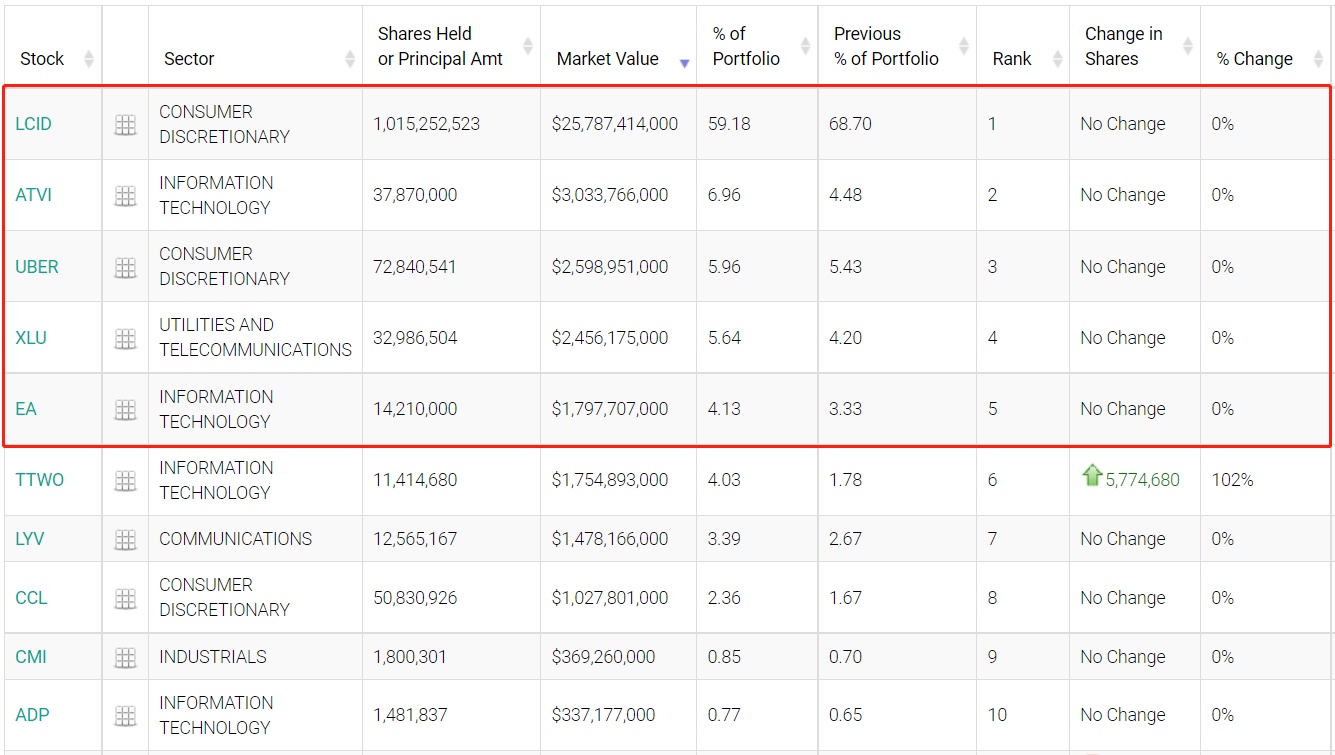 在前五大重仓股中,Lucid(LCID.US)位列第一,持仓市值约257.87亿美元,占投资组合比例为59.18%。