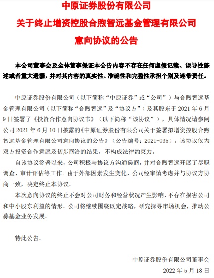 智通财经APP获悉,5月18日,中原证券(601375.SH)发布《关于终止增资控股合煦智远基金管理有限公司意向协议的公告》,决定终止双方于2021年6月9日签署的《投资合作意向协议书》。