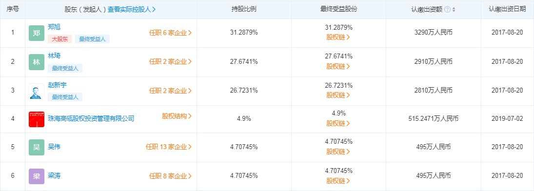 天眼查数据显示,除上述五位创始股东外,珠海高瓴股权投资管理有限公司也参与投资,出资515万持股4.9%。