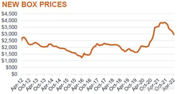 新集装箱的价格较峰值下降了25%,但仍高于新冠疫情前的水平。Sondey将2021年7月的集装箱价格高点描述为“我们从未见过的情况”,并指出“市场不可能永远保持在这个水平”。