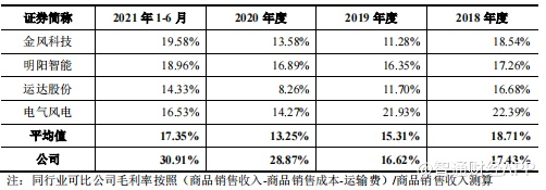 纵观报告期内公司风机及配件业务的毛利率变化,2018年公司毛利率为17.43%,略低于行业水平;自2019年起毛利率高速增长,在2021年上半年高出行业平均值近一倍。