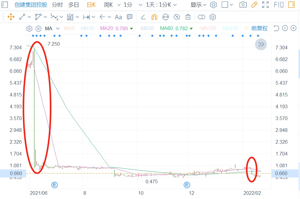 而在经历过几波闪崩、阴跌剧情之后,创建集团控股的股价早已跌破1港元,截至5月12日收盘,其股价仅为0.66港元,市值仅为7.23亿港元,与2021年2月24日最高价9.45港元相比,目前其市值已经蒸发逾96亿港元。