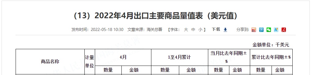 通财经APP获悉,5月18日,海关总署发布2022年4月出口主要商品量值表(美元值)。其中,4月份稀土及其制品出口9954吨,同比增长16.4%;1-4月稀土及其制品累计出口37830吨,同比增长13.6%。