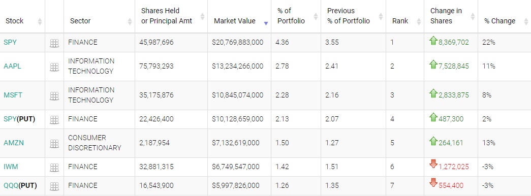 在前五大重仓标的中,标普500指数ETF(SPY.US)位列第一,持仓约4598.77万股,持仓市值约207.7亿美元,占投资组合比例为4.36%,较上季度持仓数量增加了22%;