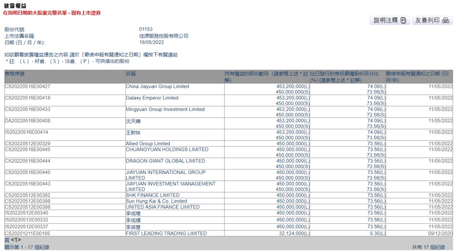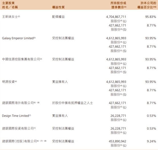 根据2021年报显示,佳源国际主席兼大股东沈天晴持有佳源国际93.95%股权,他与其家族亦持有佳源服务74.09%股权。这意味上述股份质押来自控股股东沈天晴。此外,佳源国际还曾在年报中披露,大股东抵押予建银国际4.54亿股。