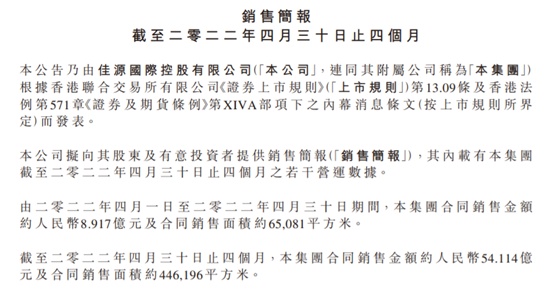 不过,我们依然能够从2021年报中看出些许端倪,佳源国际目前短期银行存款、现金及现金等价物以及受限制资金总额为98.3亿,较2020年下降47%。然而,公司2022年前四个月销售额仅8.92亿,较上年同期的约17.26亿元几乎腰斩,销售额大幅下滑,存在入不敷出,短期偿债压力陡增的风险。