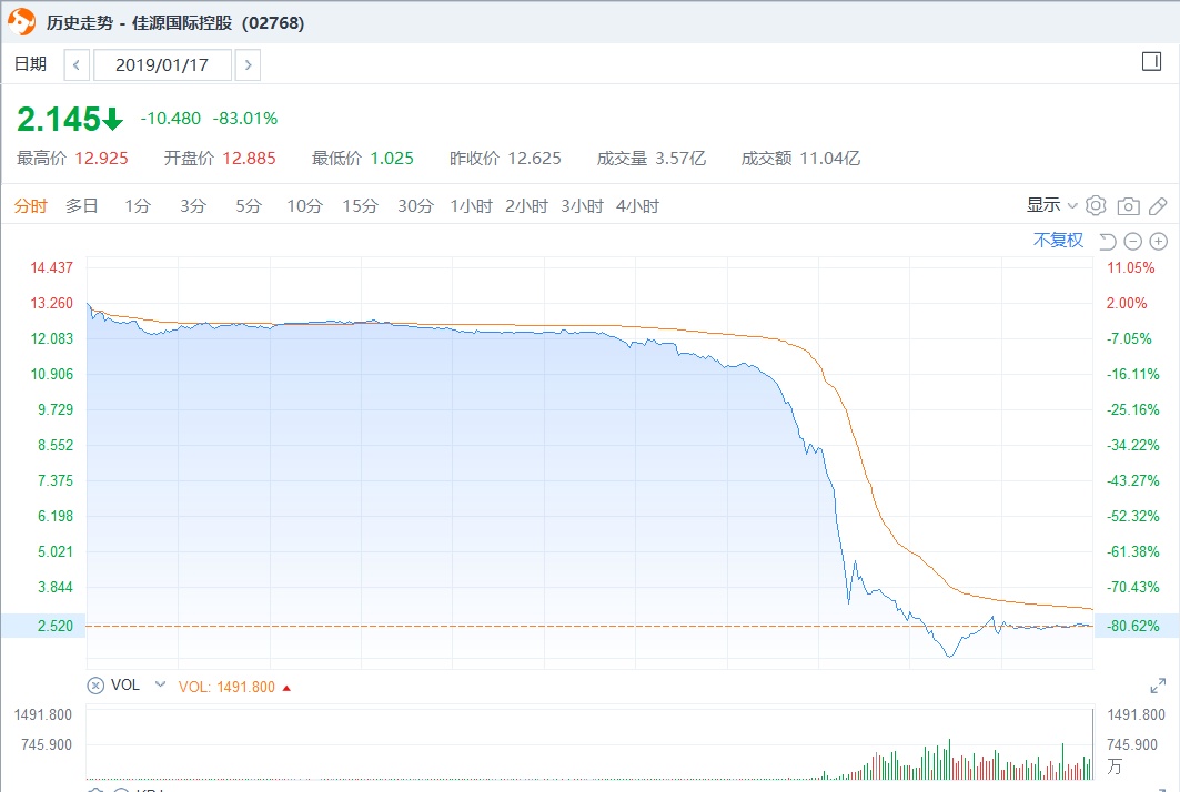 这并非佳源国际的资本市场中的“闪崩”首秀,早在2019年1月17日,佳源国际控股股价盘中闪崩,截至收盘,该公司股价从13.26港元跌至2.52港元,暴跌80%。而1月18日开盘,“报复式”反弹开始,盘中股价一度大幅上涨99.2%至每股最高5.02港元,截至收盘,报收4.4港元,上涨74.6%。