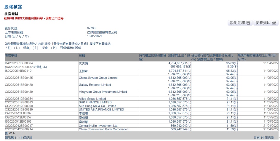 无独有偶,此次的暴跌或许依然与质押盘有所关联。据联交所权益露显示,于5月11日,新鸿基财务因“保证权益”事宜,取得佳源国际股份,涉及股份达10.365亿股,股权占比约21.11%。以当日收市价1.08亿元计,股份市值达11.19亿元。