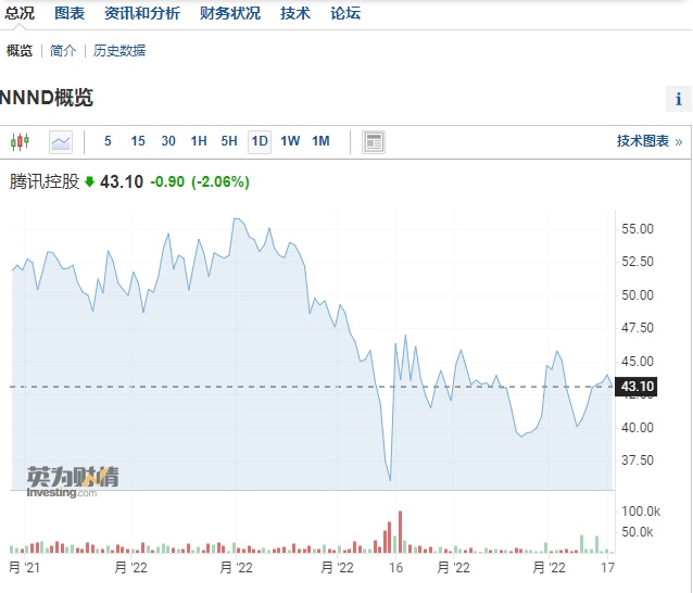 智通财经APP获悉,今日(5月18日)港股盘后,腾讯(00700)公布第一季度业绩。数据显示,腾讯第一季度实现营收1354.71亿元,同比基本持平。财报公布后,德国法兰克福市场上,腾讯小幅下跌,截至北京时间16:57,该股跌2.06%,报43.10欧元,折合约355.67港元,较港股收盘价365.60港元跌约2.7%。