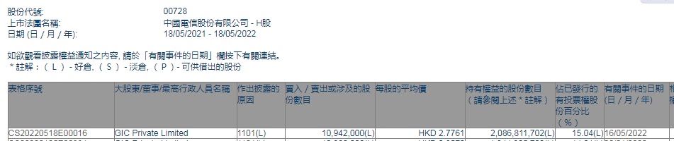 智通财经APP获悉,香港联交所最新资料显示,5月16日,GIC Private Limited增持中国电信(00728)1094.20万股,每股作价2.7761港元,总金额约为3037.61万港元。增持后最新持股数目约为20.87亿股,最新持股比例为15.04%。