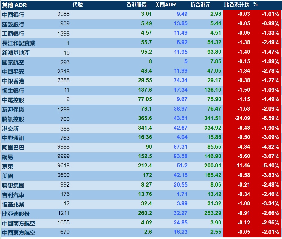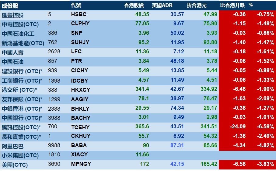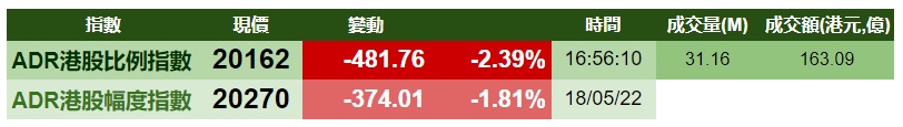 智通财经APP获悉,周二美股三大指数悉数下跌,港股ADR指数下跌,按比例计算,收报20162点,较香港收市跌481.76点或2.39%。