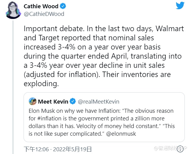 伍德回应了这条推文,并表示消费者在减少支出的同时,也在“反抗购买力的下降”。她补充称,与通胀上升有关的供应链瓶颈可能是由企业过度订货造成的。