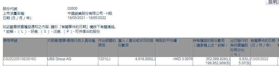 智通财经APP获悉,香港联交所最新资料显示,5月13日,瑞银集团减持中国铝业(02600)491.80万股,每股作价3.0976港元,总金额约为1523.40万港元。减持后最新持股数目约为3.52亿股,最新持股比例为8.93%。