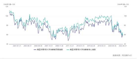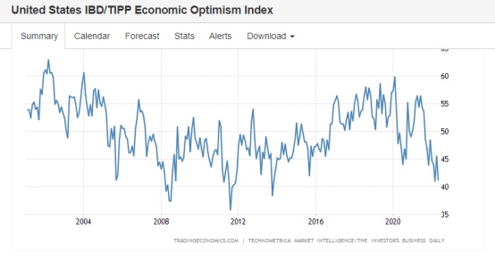 在美国持续高企的通胀率,以及美联储大幅加息普遍预期的重压之下,美国消费者信心及预期早已受到打压,反映在量化数据之中就是各大权威信心指数悉数下行。比如,密歇根大学消费者信心指数以及密歇根大学消费者预期指数均处于近20年左右的相对较低水平,衡量市场对美国宏观经济乐观与否的IBD/TIPP经济乐观指数处于近20年来的低位附近。