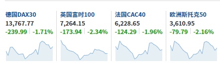 2. 截至发稿,德国DAX指数跌1.71%,英国富时100指数跌2.34%,法国CAC40指数跌1.96%,欧洲斯托克50指数跌2.16%。