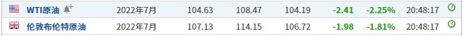 3. 截至发稿,WTI原油跌2.25%,报104.63美元/桶。布伦特原油跌1.81%,报107.13美元/桶。