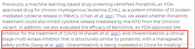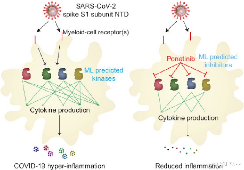 2021年,华盛顿大学福瑞德·哈金森癌症研究中心的系统生物学家Taran Gujral发表了一篇文章,揭示了新冠病毒NTD能够诱发PBMC释放大量细胞因子的现象,通过AI筛选平台并发现这一过程与JAK1、EPHA7、IRAK1、MAPK12和MAP3K8等多种蛋白激酶有关,并进一步证实多激酶抑制剂Ponatinib是SARS-Cov-2-NTD介导细胞因子释放的有效抑制剂。
