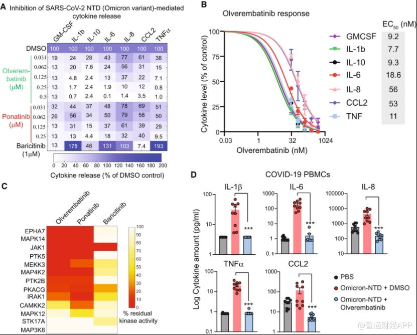由以上数据,该研究得出结论:奥雷巴替尼可以通过阻断其中的大多数激酶来抑制NTD诱导的PBMCs中细胞因子释放,从而缓解炎症。这意味着靶向SARS-CoV-2及其多个变种介导的细胞因子释放所必需的多激酶药物,如奥雷巴替尼,有望为中重度COVID-19患者提供新的治疗选择。