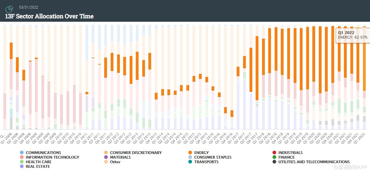 从持仓偏好来看,今年一季度,能源类依然占据黑石总持仓比例第一,占比达62.07%。