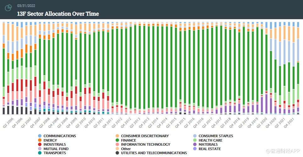 桥水基金的持仓也更加多元化。今年一季度,日用消费品股、金融股、医疗保健股和非必需消费品股分别占总持仓的24.12%、23.51%、16.7%、12.61%。