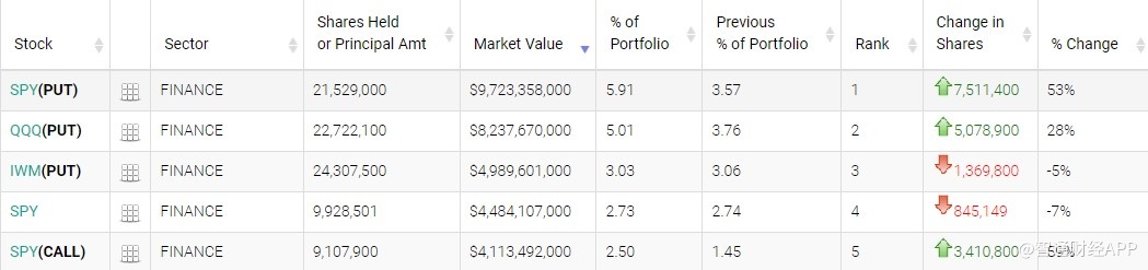 在花旗前五大重仓股中,指数看跌期权占据前三席,标普500指数ETF、标普500指数ETF看涨期权则分别位于第四、五位。