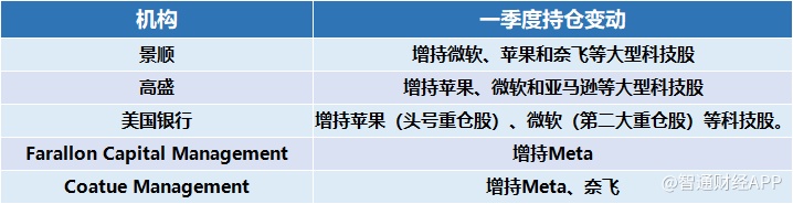 除了景顺,还有部分机构一季度仍加仓科技股。比如,高盛和美国银行一季度都增持了苹果、微软等科技股。一些对冲基金,比如Farallon Capital Management和Coatue Management也增持了部分科技股公司的股票。