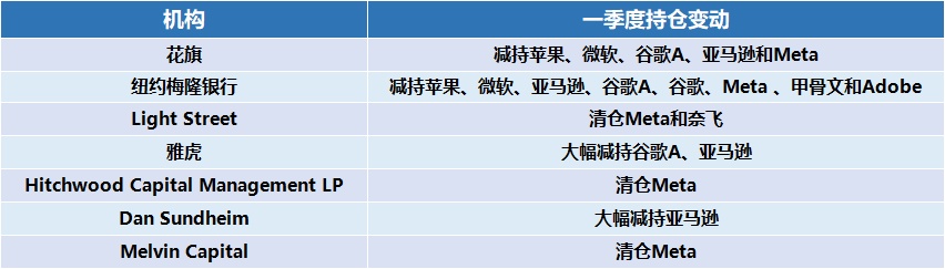 花旗一季度对大型科技“FAAMG”有5%-22%不等的减持幅度,其中,苹果、微软、谷歌A(GOOGL.US)的减持幅度分别达到22%、17%和9%;而亚马逊和Meta(FB.US)则相对低点,分别为4%和5%。