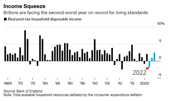 英国央行公布的预测数据显示,英国家庭2022年实际税后可支配收入将出现负增长,英国消费者或将面临着有记录以来生活水平极为糟糕的一年。