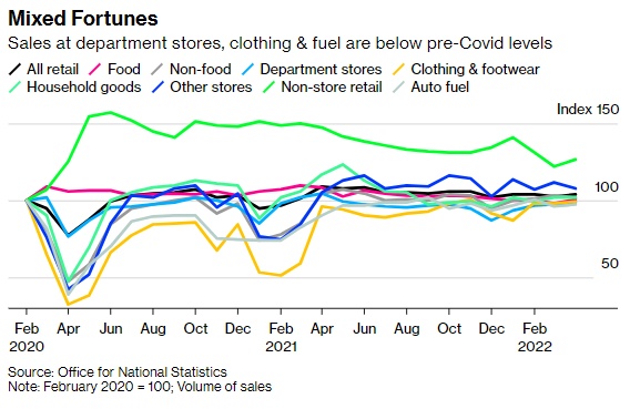 彭博经济学Niraj Shah表示:“不要被4月份零售销售额所欺骗。一代人以来最大程度的收入紧缩将在未来几个月进一步限制消费者支出。彭博经济预测,随着通胀上升的影响挤压以家庭为单位的购买力,英国经济将很快失去动力。”