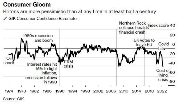 智通财经APP获悉,市场调研机构GfK今日公布的数据显示,英国消费者信心已跌至至少48年来的最低水平。生活成本急剧上升使得英国消费者的信心比上世纪70年代能源危机最严重时期,以及10多年前经济衰退期间更加悲观。