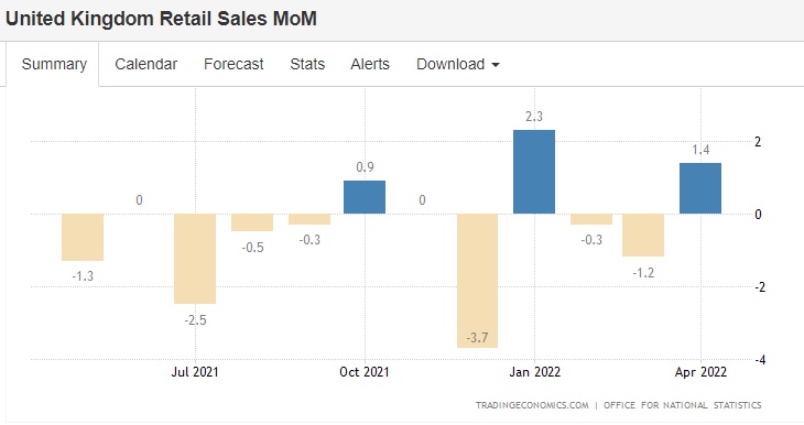 今日公布的官方数据还显示,4月份零售销售额竟意外实现正增长,环比增1.4%,市场普遍预期为环比下降0.2%,前值为环比下降1.2%。正是在4月,CPI同比暴增9%,能源账单金额飙升一半以上,政府对工资税也进行了上调。