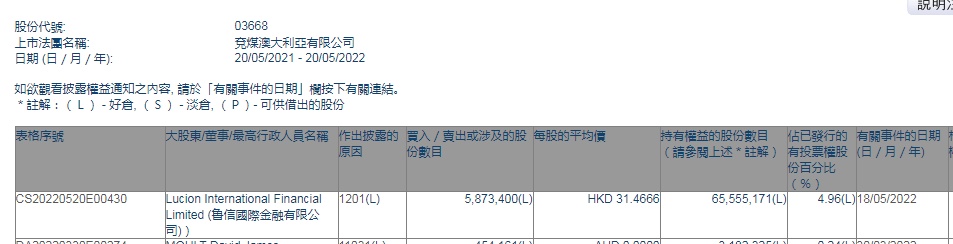 智通财经APP获悉,香港联交所最新资料显示,5月18日,鲁信国际金融有限公司减持兖煤澳大利亚(03668)587.34万股,每股作价31.4666港元,总金额约为1.85亿港元。减持后最新持股数目约为6555.52万股,最新持股比例为4.96%。