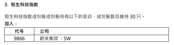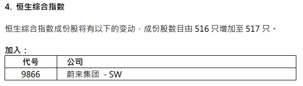 智通财经APP获悉,5月20日,恒生指数公司宣布截至2022年3月31日的恒生指数系列季度检讨结果,所有变动将于2022年6月13日(星期一)起生效。其中,蔚来-SW(09866)被纳入恒生科技指数及恒生综合指数成份股。