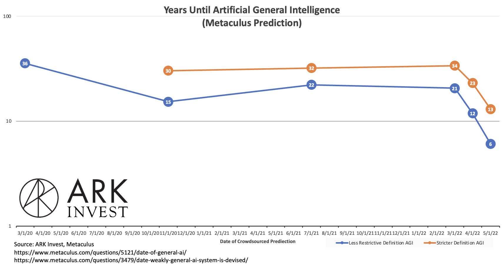 她在推特上引用了ARK研究部负责人Brett Winton在推特上发布的一篇帖子。“(你)被太多的噪音分散了注意力……在过去的2个月里,预计能够实现通用型人工智能的时间缩减了60 - 70%,” Winton在推特上表示。